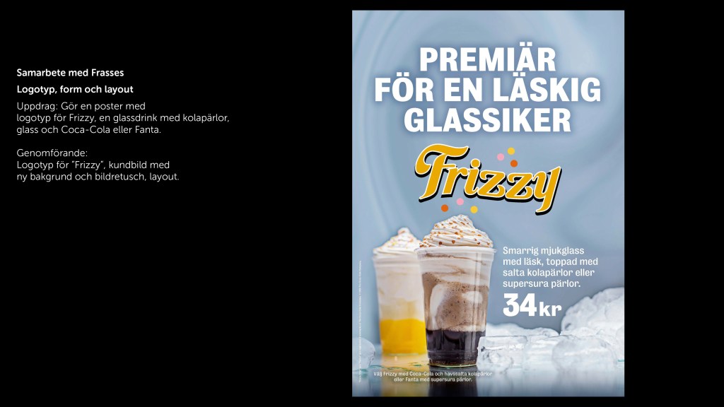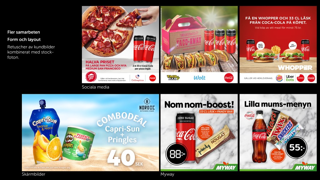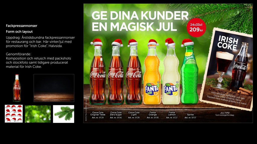Några exempel på fackpressannonser, butiks- och mässmaterial, menyer, och samarbeten. Klicka på galleriet för att bläddra.